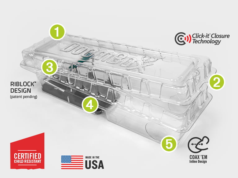 Made of a durable and clear, high-impact resin, DoomBox features patented Click-it™ Closure Technology, a simple, yet ingenious closure system that, in conjunction with Riblock™ design, makes it extremely easy for adults to access, but difficult, if not impossible, for young children and pets to get into. The technology is revolutionizing the packaging and container industry because of secure, reliable, and child-resistant performance and it’s a key feature on DoomBox.